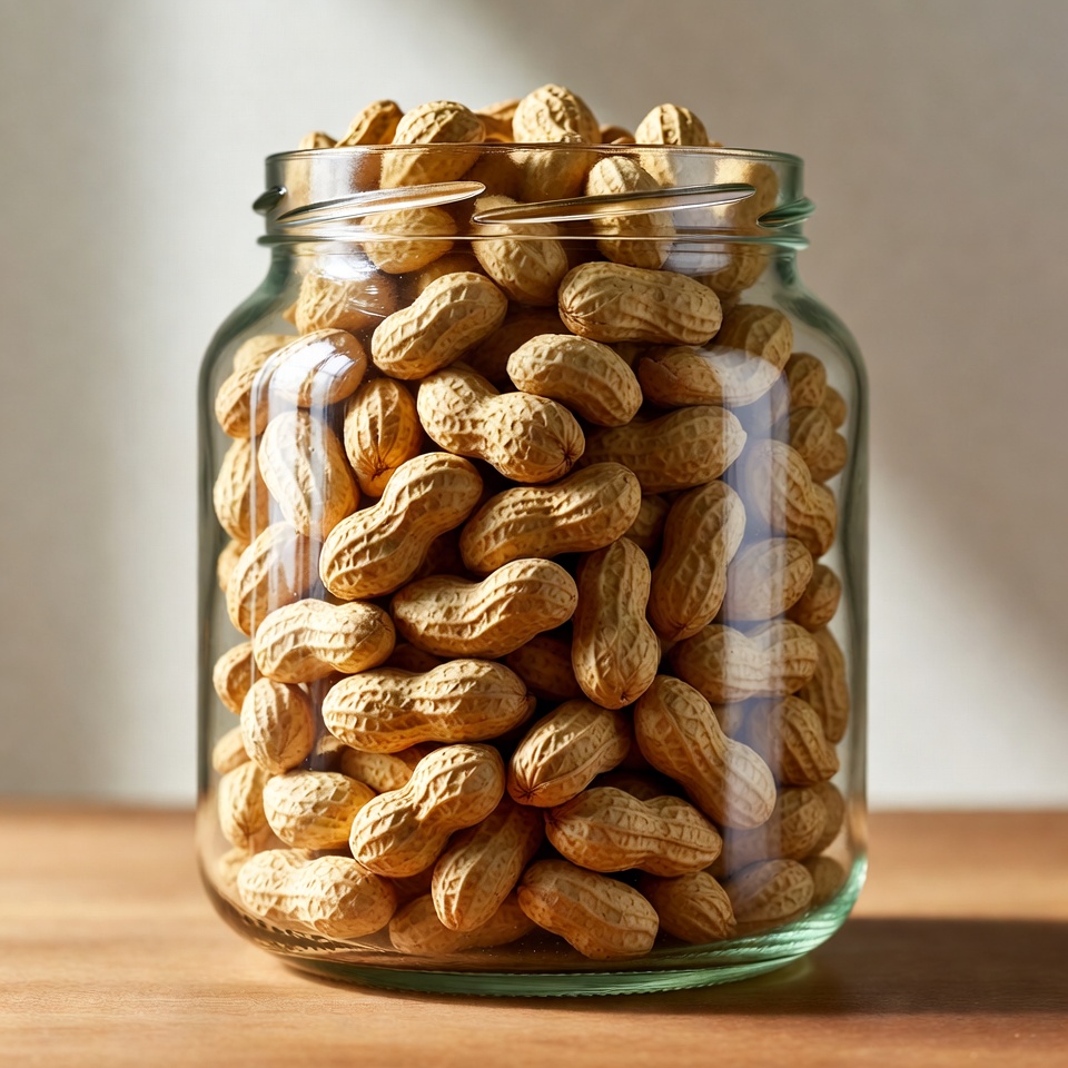 A clear glass jar filled to the brim with whole peanuts sits on a wooden table. Sunlight streams in from the side, casting soft shadows and highlighting the textured shells of the peanuts. The jar is viewed from the front against a plain white background.
