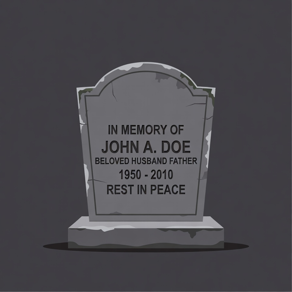 A simple illustration of a gray gravestone on an isolated dark background. The tombstone features an arched top with engraved text reading 'In Memory of John A. Doe, Beloved Husband and Father, 1950-2010, Rest in Peace'. Moss and wear details are visible on the stone edges.