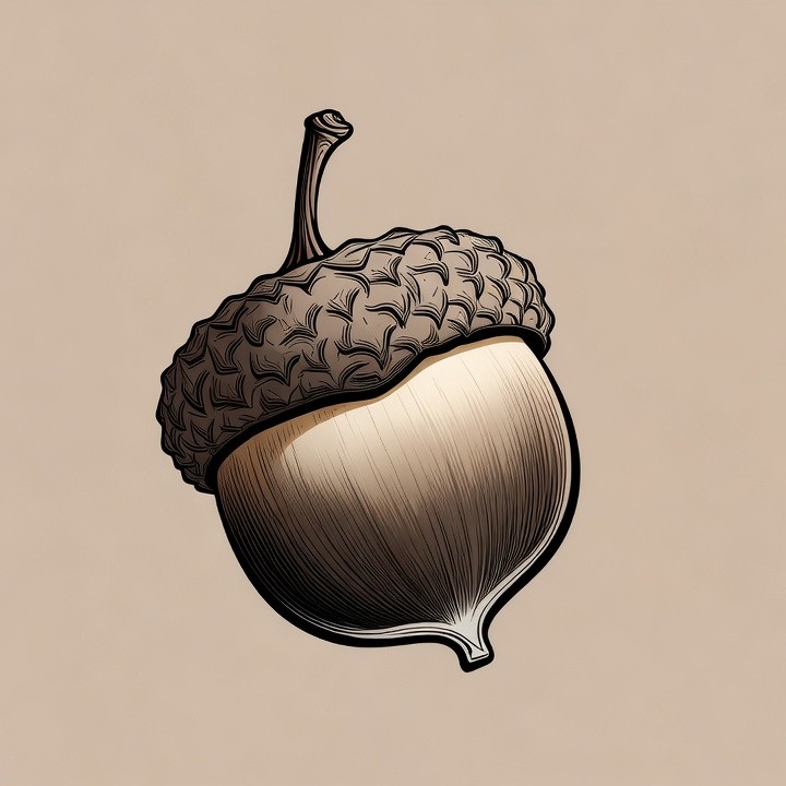A detailed line art illustration of an acorn features a textured brown cap and smooth light brown nut. The acorn is centered against a plain beige background with subtle shading for depth. The drawing style uses ink-like strokes for a hand-drawn appearance.