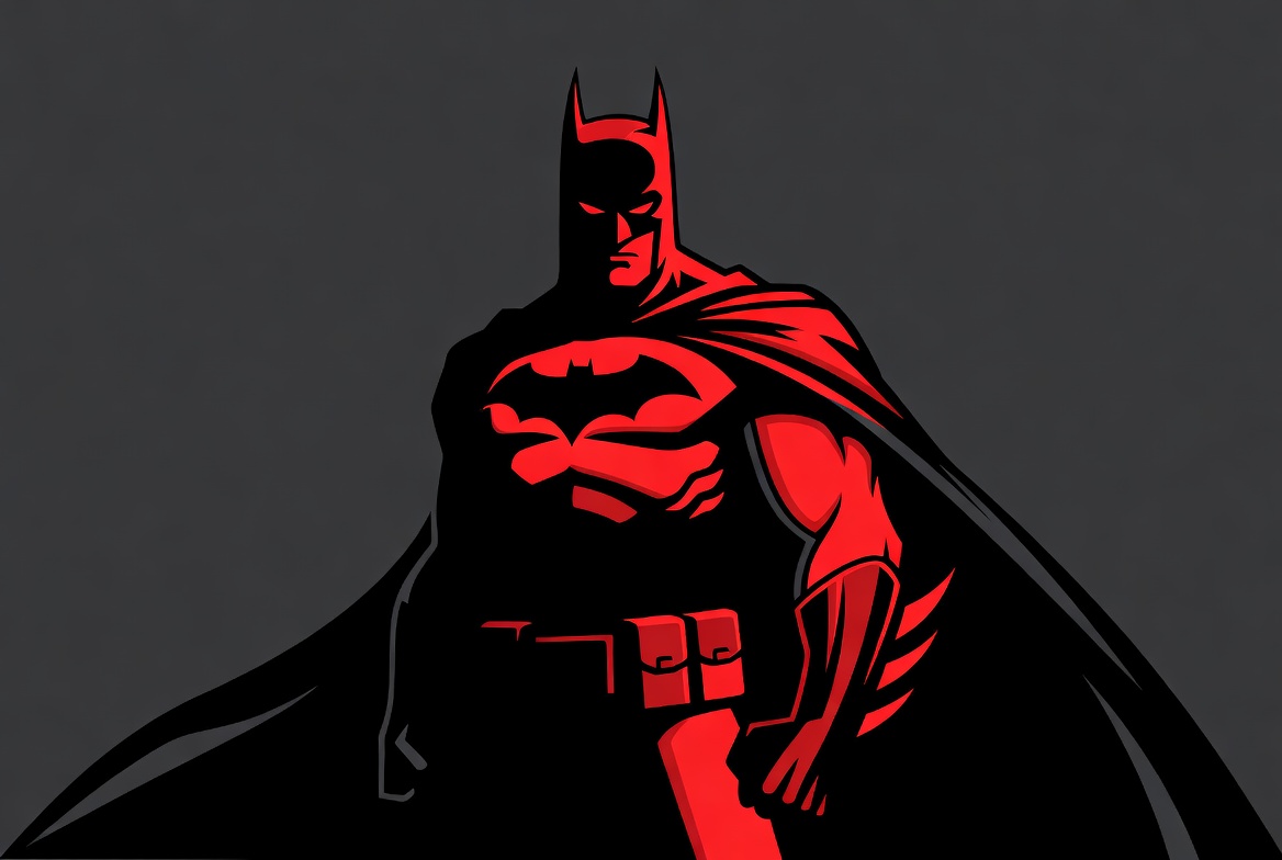 A striking red silhouette illustration of Batman stands heroically against a dark gray background. He wears his iconic cape, bat emblem on the chest, and utility belt with muscular arms extended. The bold red outlines emphasize his fierce expression and dynamic pose.