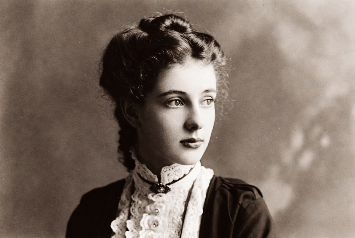 A young woman with an elaborate updo hairstyle gazes slightly to the side in a sepia-toned portrait. She wears a high-necked black dress adorned with intricate white lace collar and cuffs. Her fair skin and soft features are highlighted against a neutral studio background.