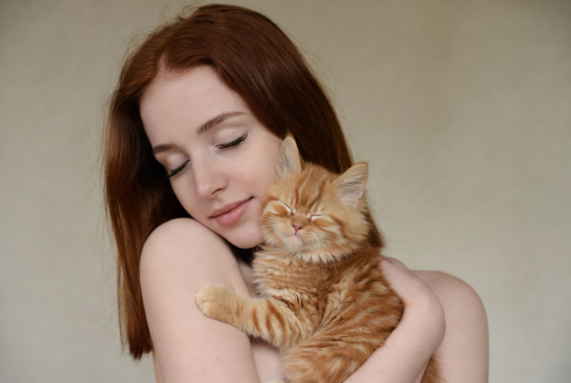 A young woman with long red hair holds a fluffy orange kitten close to her chest. The kitten has squinted eyes and is nestled against her bare arms. Both are centered against a light beige background.