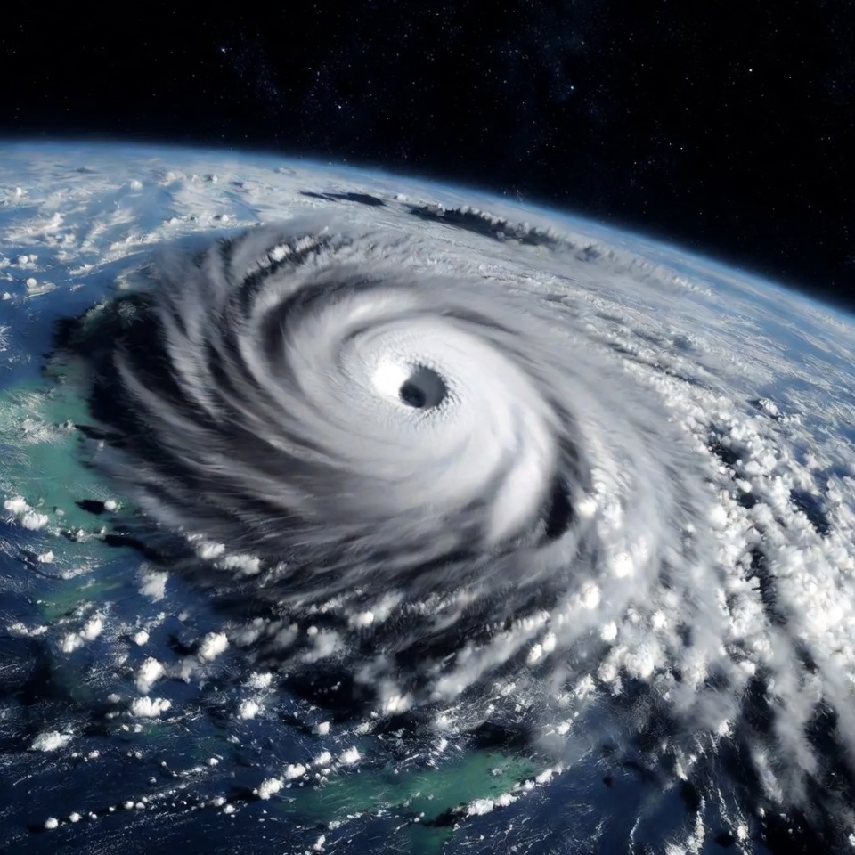 A massive hurricane swirls over the Earth's surface, viewed from space against a starry black background. The storm's eye is clearly visible amid thick white clouds, with the blue planet's oceans and green landmasses partially seen below. The image captures the cyclone's powerful spiral structure in dramatic detail.