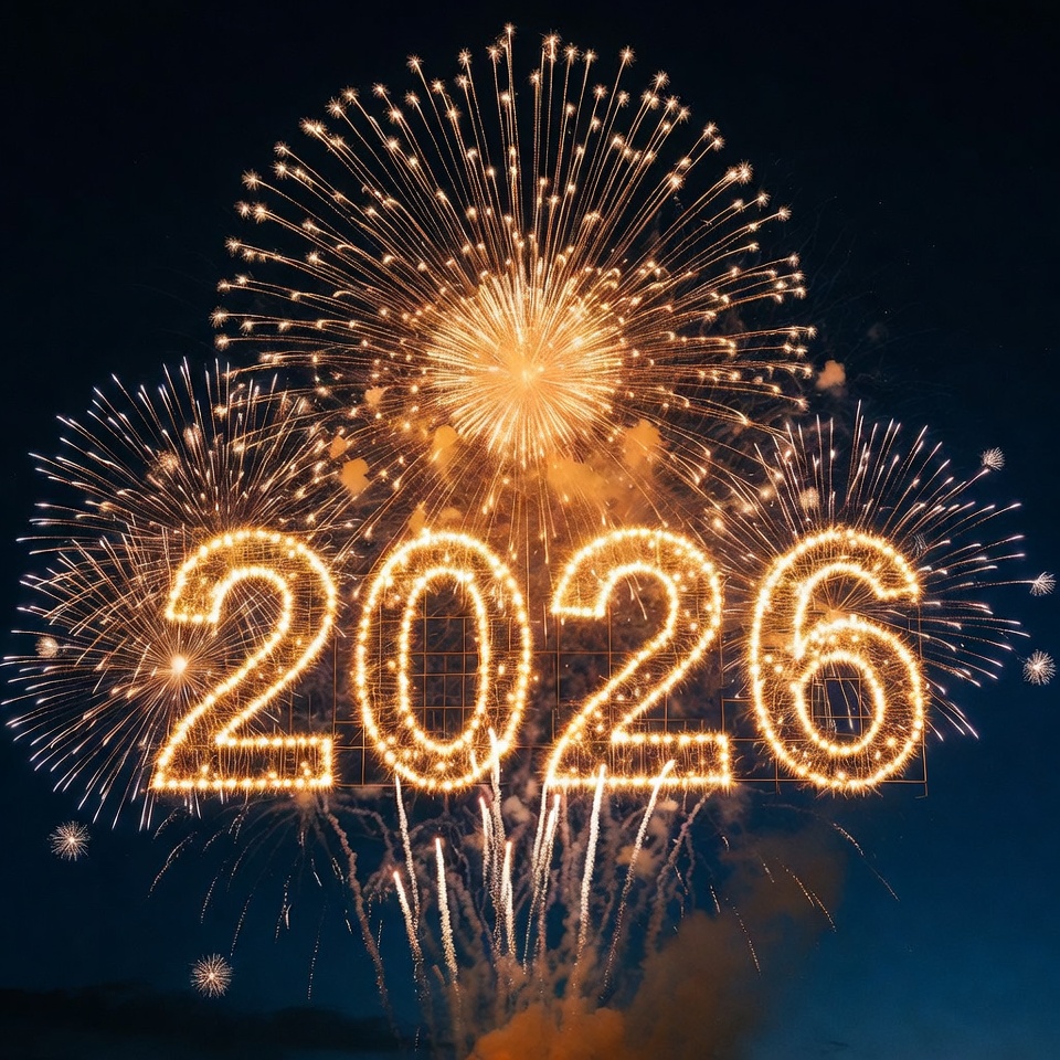 Golden fireworks form the number 2026 against a dark night sky. Bright bursts and sparks surround the large numerals. The design celebrates the upcoming new year.