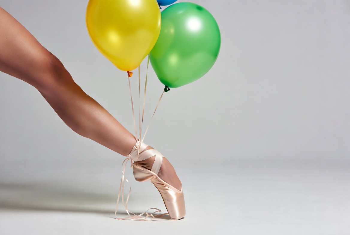 A woman's toned leg in pink pointe shoes holds strings of a yellow balloon and a green balloon. The leg is extended gracefully on a plain white background. The balloons float above the foot, isolated for a clean composition.