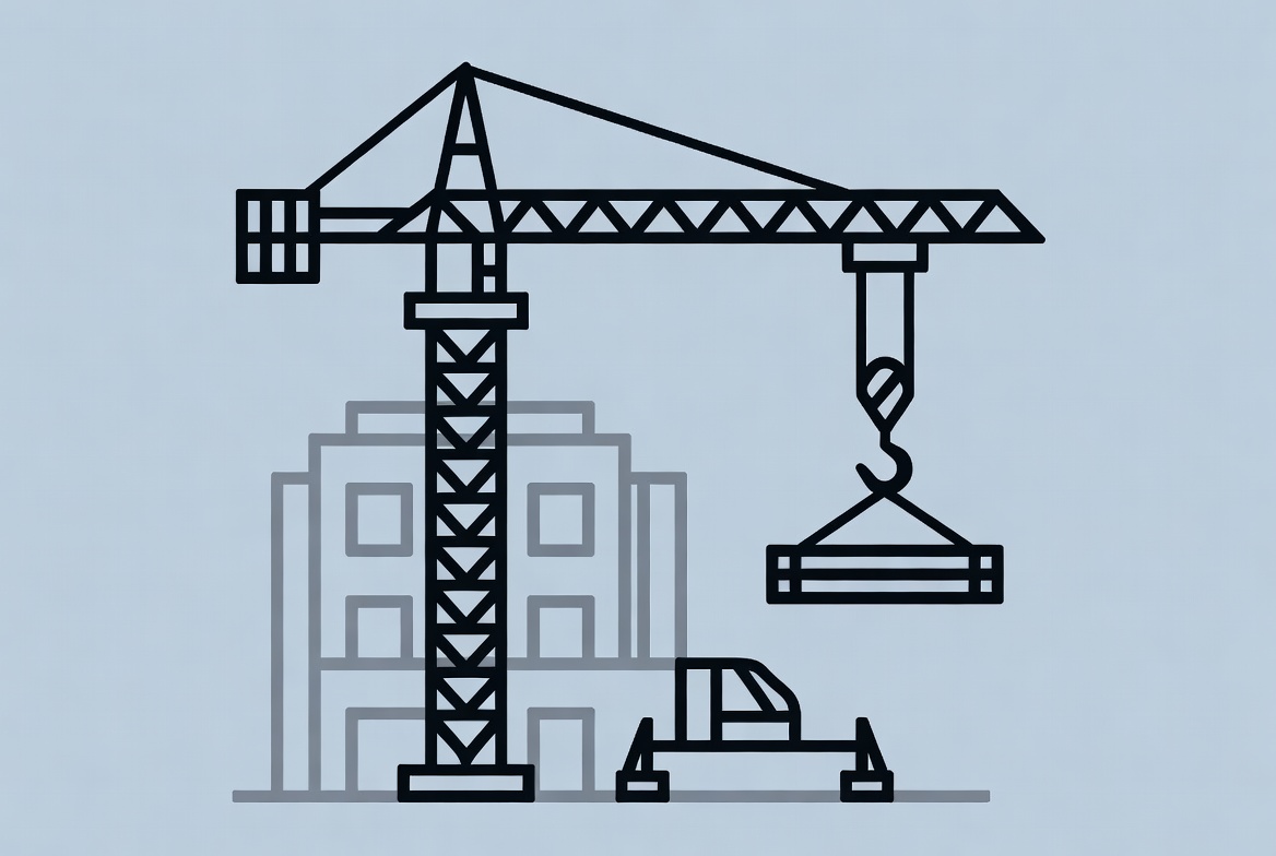 A black line drawing of a tall construction crane lifting a steel beam over a city building. A truck is positioned nearby on the ground. The illustration features a light blue background with clean, minimalist outlines.