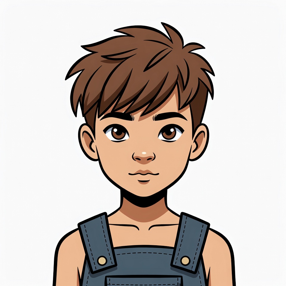 A cartoon illustration of a young boy with spiky brown hair and large expressive eyes faces forward on a white background. He wears blue denim overalls with straps over his bare shoulders. The image features bold outlines and vibrant colors typical of vector clipart.