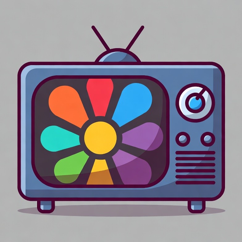 A flat vector illustration features a blue retro television with antennas. The screen displays a vibrant rainbow-colored flower with petals in red, orange, yellow, green, blue, and purple. A knob and details are visible on the TV set against a gray background.