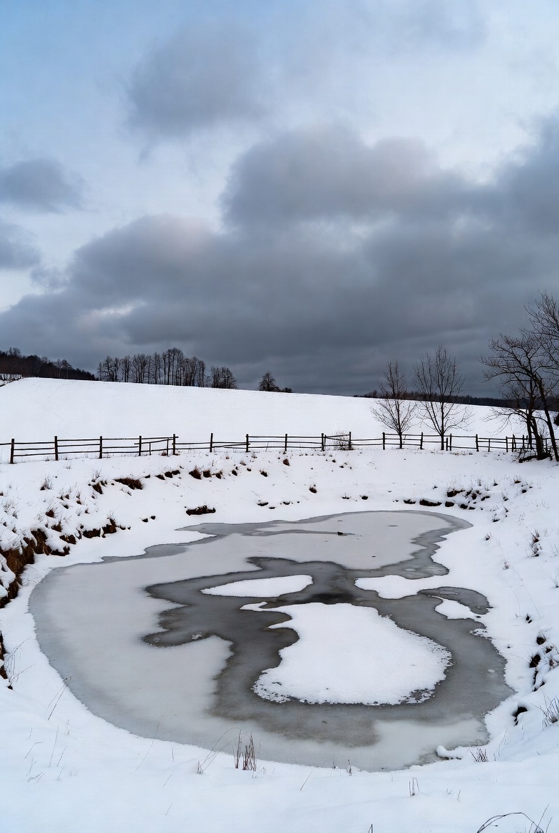 A frozen pond with irregular ice patterns sits in a snowy field surrounded by bare trees and a wooden fence. Dark gray clouds fill the sky above the winter scene. Snow covers the ground and edges of the pond.