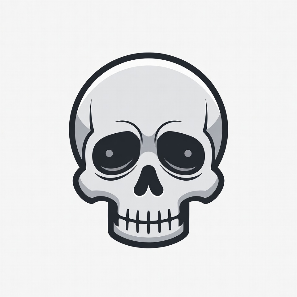A minimalist cartoon skull with bold black outlines on a white background. It features dark eye sockets, a wide nasal cavity, and grinning teeth. The design is simple and vector-style.
