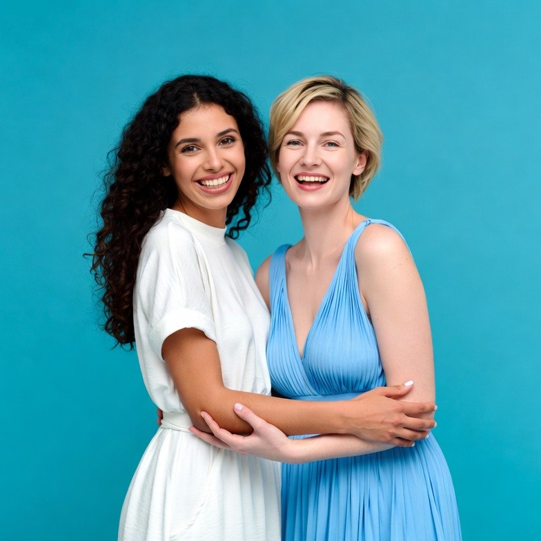 Two smiling women embrace each other against a solid blue background. One has curly dark hair and wears a white dress, while the other has short blonde hair and a blue dress. They stand close with arms around each other.