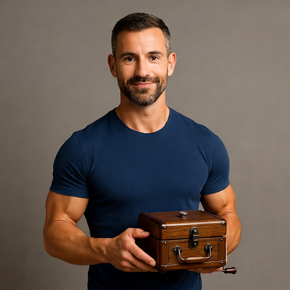 A muscular middle-aged man with short dark hair, beard, and blue t-shirt stands confidently against a gray background. He holds a small ornate wooden box with a crank handle in both hands. His arms are toned and he smiles slightly at the camera.