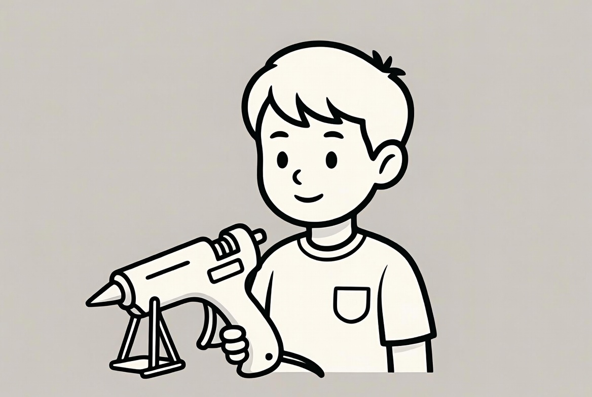 A cartoon boy with short hair smiles while holding a black outline glue gun in his right hand. He wears a simple short-sleeved shirt with a pocket and stands on a light gray background. The glue gun rests on a small stand next to him.