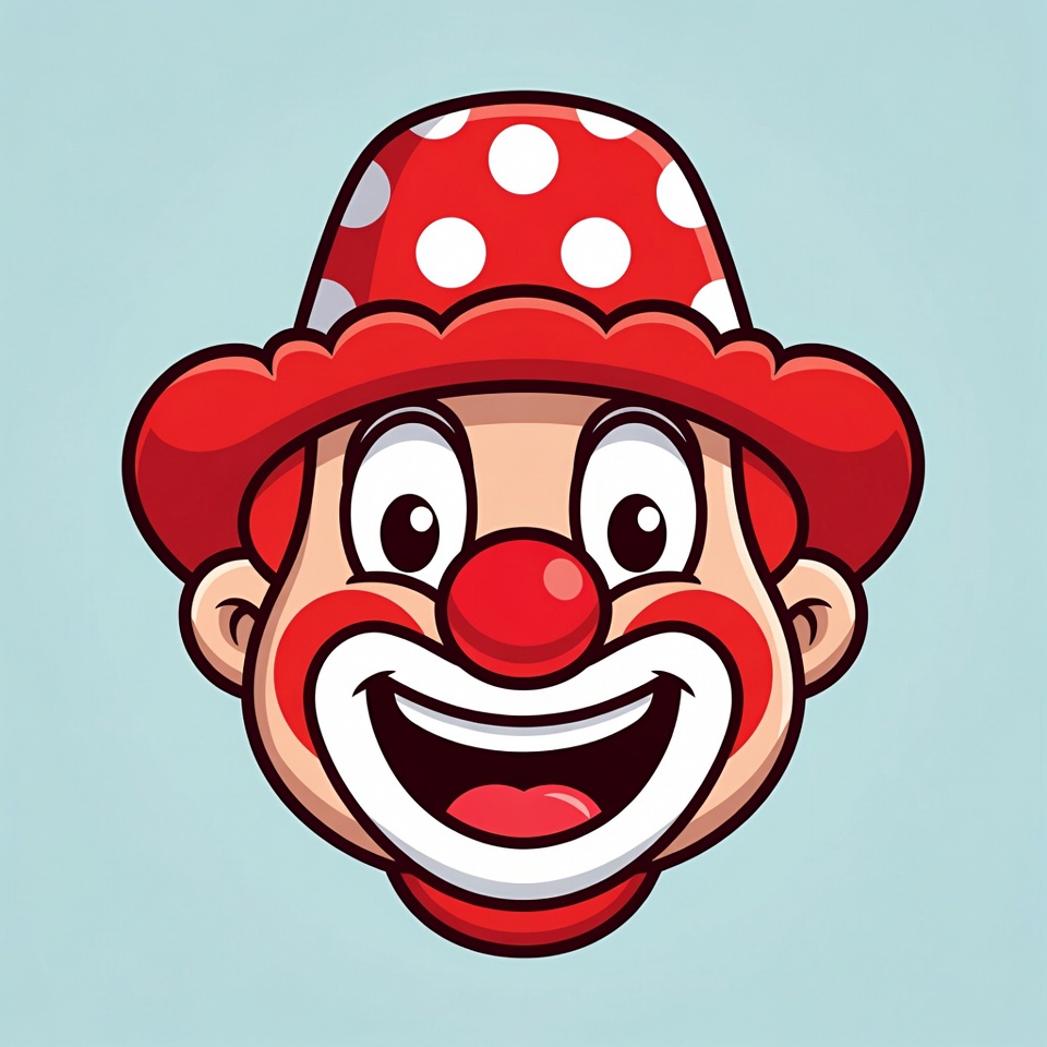 A colorful cartoon illustration of a clown's face with a wide smile and big eyes. He wears a red polka-dot hat and has a large red nose. The figure is set against a light blue background.