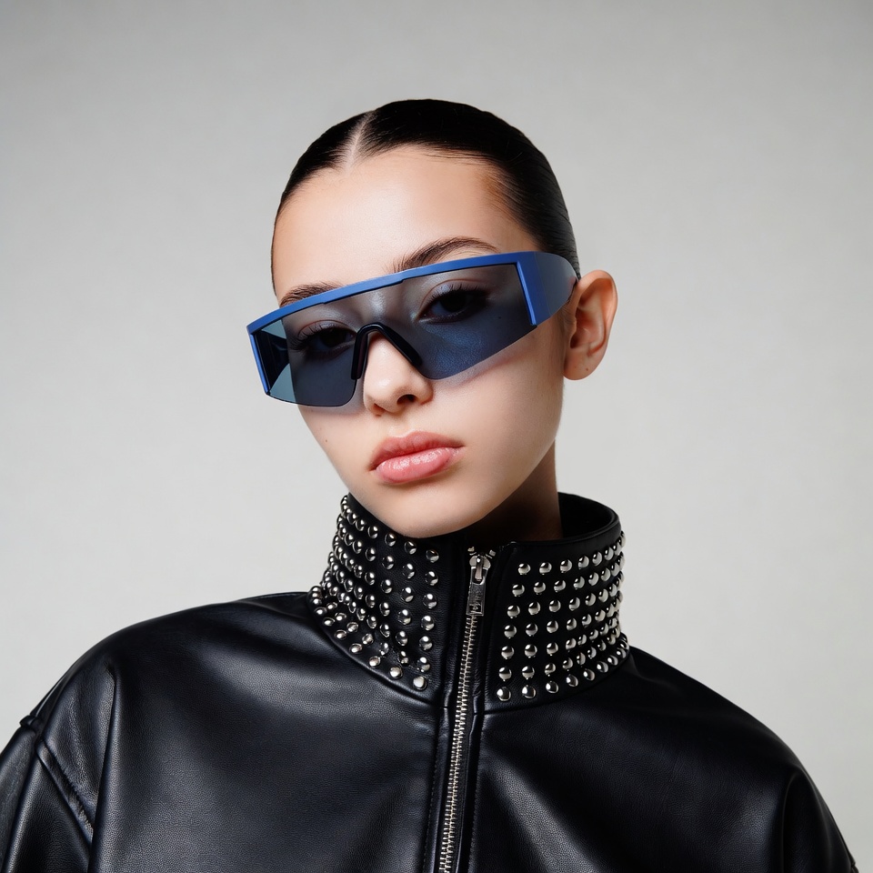 A young Asian woman with sleek black hair pulled back stares directly at the camera. She wears oversized blue futuristic sunglasses and a black leather jacket with a tall studded collar. The image is a close-up portrait on a plain background.