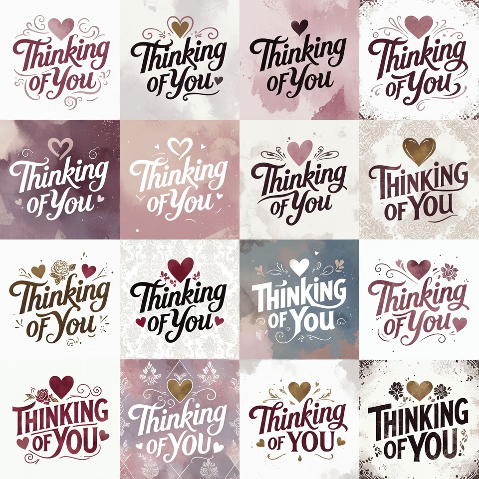 A 6x6 grid displays various artistic designs of the phrase 'Thinking of You' in elegant script fonts. Each design features decorative hearts in pink, purple, gold, and watercolor-style backgrounds. The typography varies in style, color, and heart embellishments across the isolated white background.