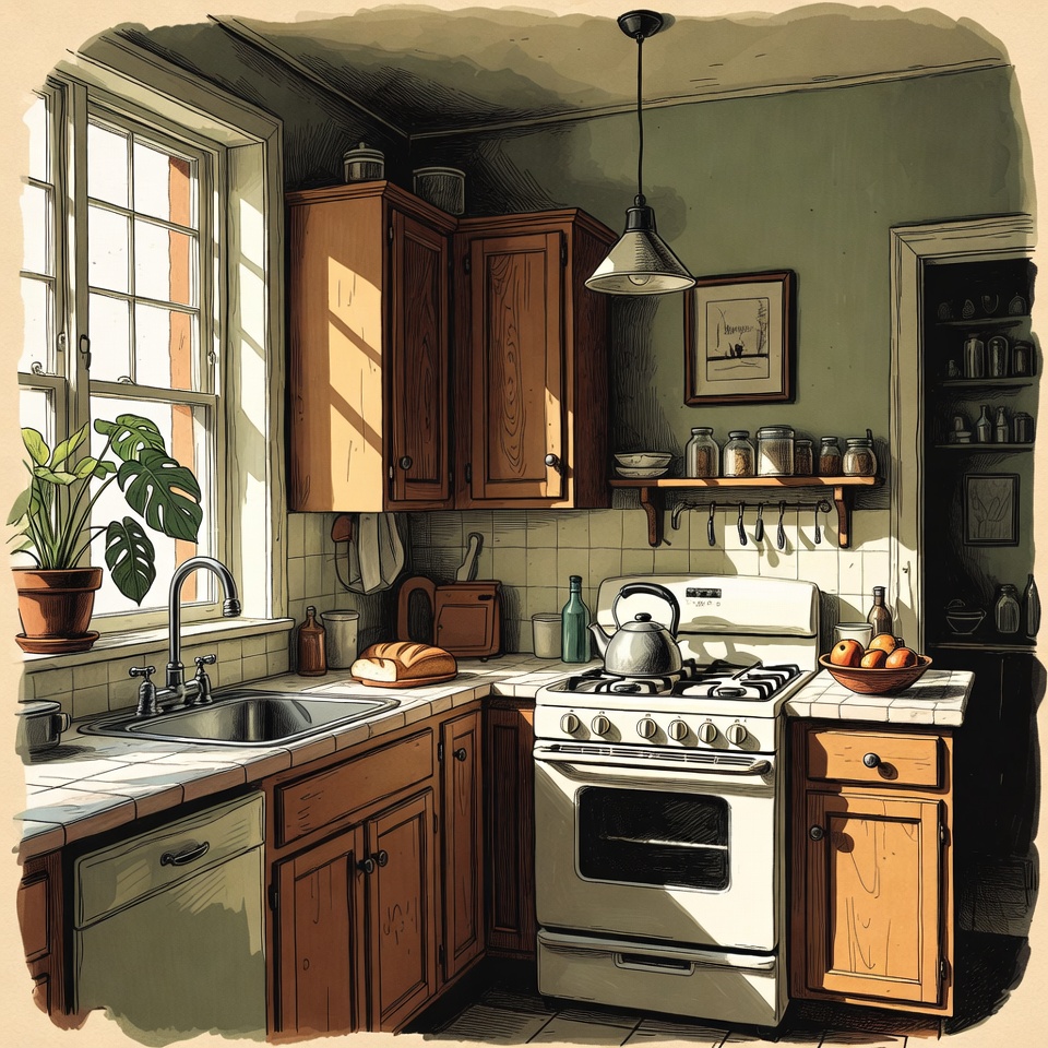 A detailed illustration of a cozy vintage kitchen with wooden cabinets, white appliances, and sunlight streaming through the window. A sink with running water, toaster, bread loaf, kettle on the stove, and potted plants are visible on the counter. Green walls, hanging pendant light, and open shelves with jars complete the retro scene.