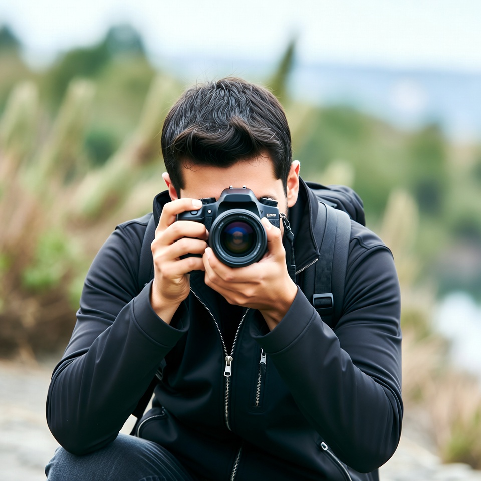 A young man with short dark hair kneels on a rocky path near green bushes and water, intently photographing through his large DSLR camera lens. He wears a black zip-up jacket and backpack. The outdoor setting features natural greenery and a blurred background.
