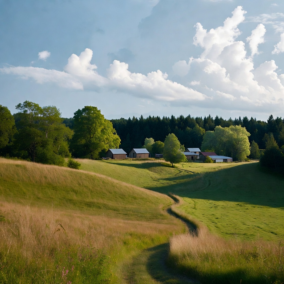 blue sky, coniferous trees, countryside, deciduous trees, dirt path, farmland, fields, forest background, golden grass, grassy fields, green hills, idyllic scenery, meadows, metal roofs, nature, path, rolling hills, rural landscape, scenery, summer landscape, trees, white clouds, wild grass, wooden barns, barns