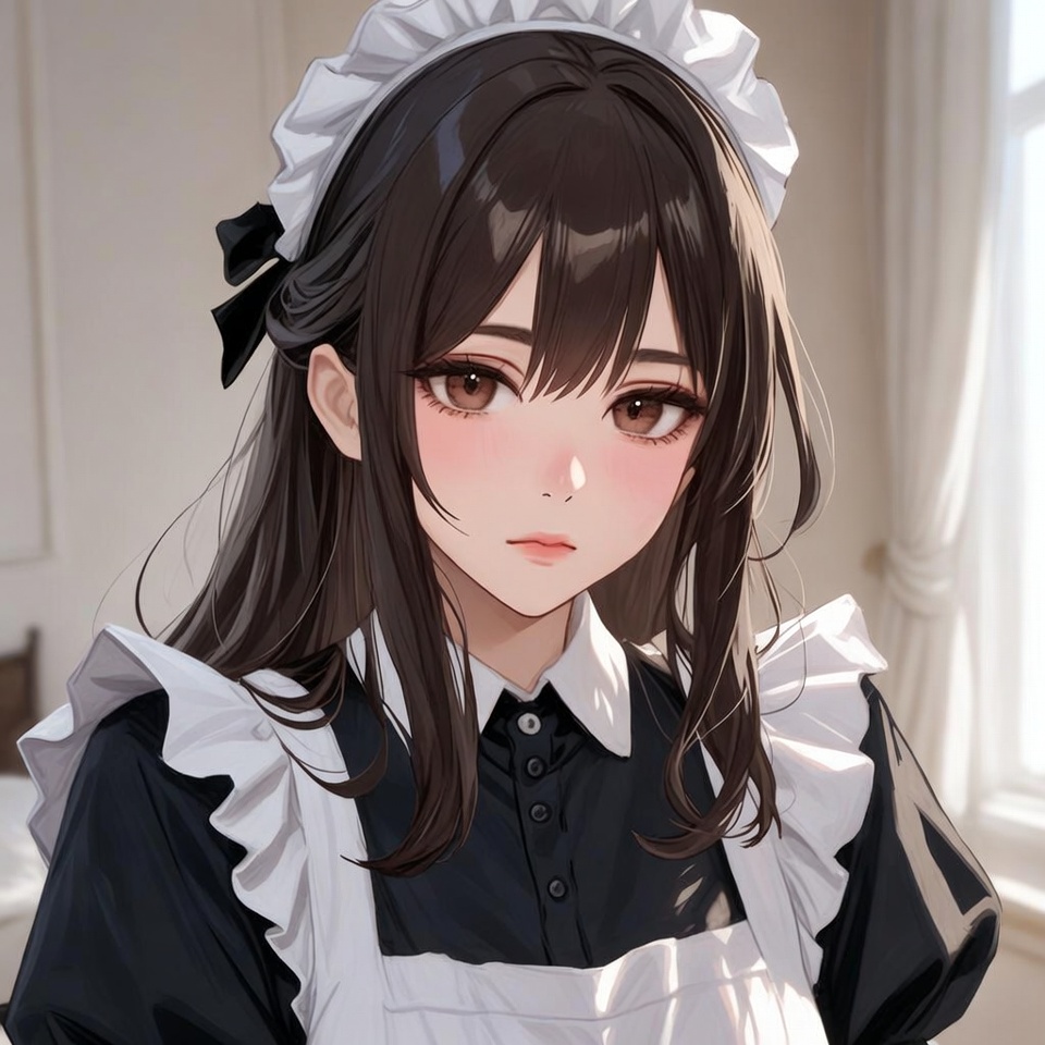 An anime-style illustration of a young woman with long black hair wearing a classic black maid uniform and white frilly headband. She has large expressive eyes and a slight blush on her cheeks, standing indoors near a window with curtains. The detailed artwork features ruffled apron edges and a black bow accent.