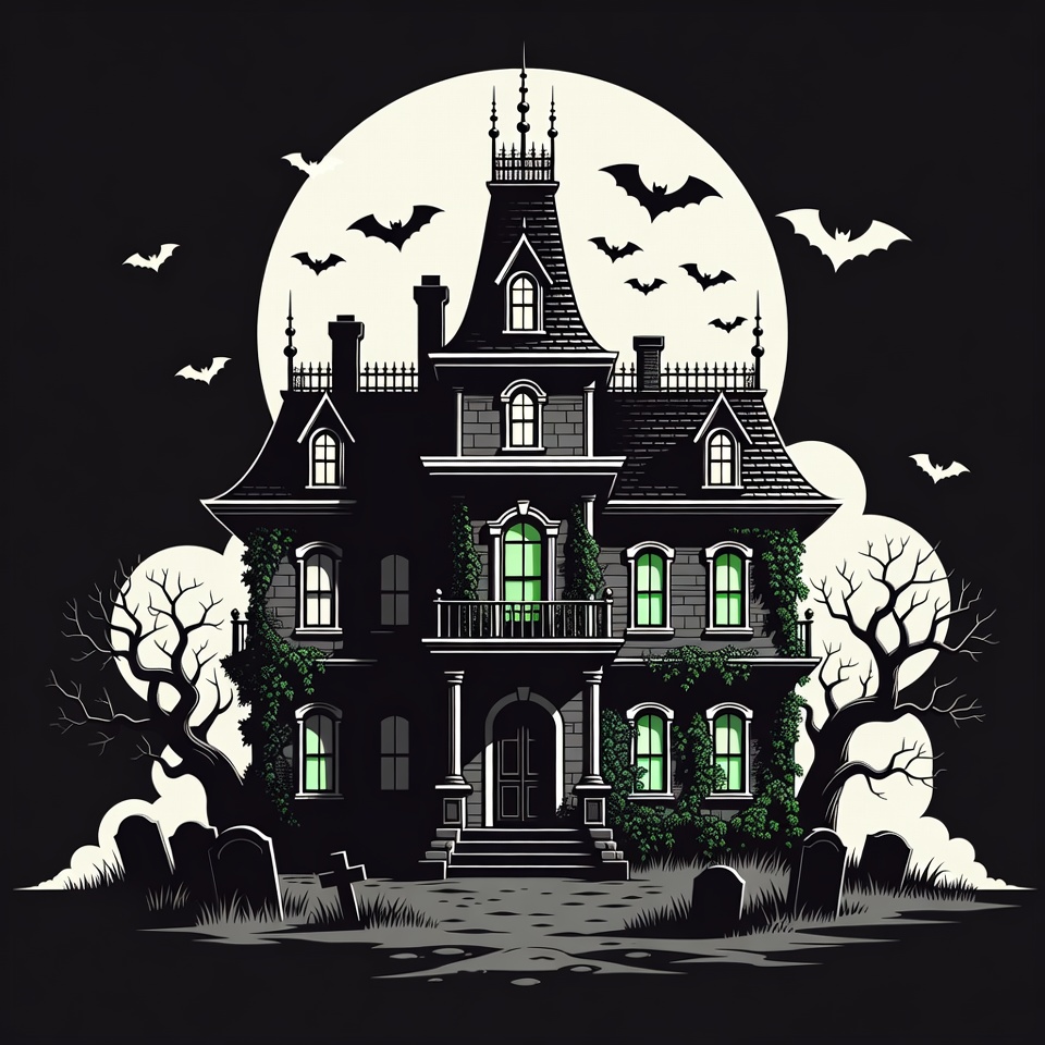Halloween, Halloween illustration, Victorian house, barren trees, bats, bats flying, clipart, dark silhouette, full moon, gothic mansion, graveyard, green windows, horror house, illustration, isolated background, ivy vines, night sky, spooky house, tombstones, haunted house