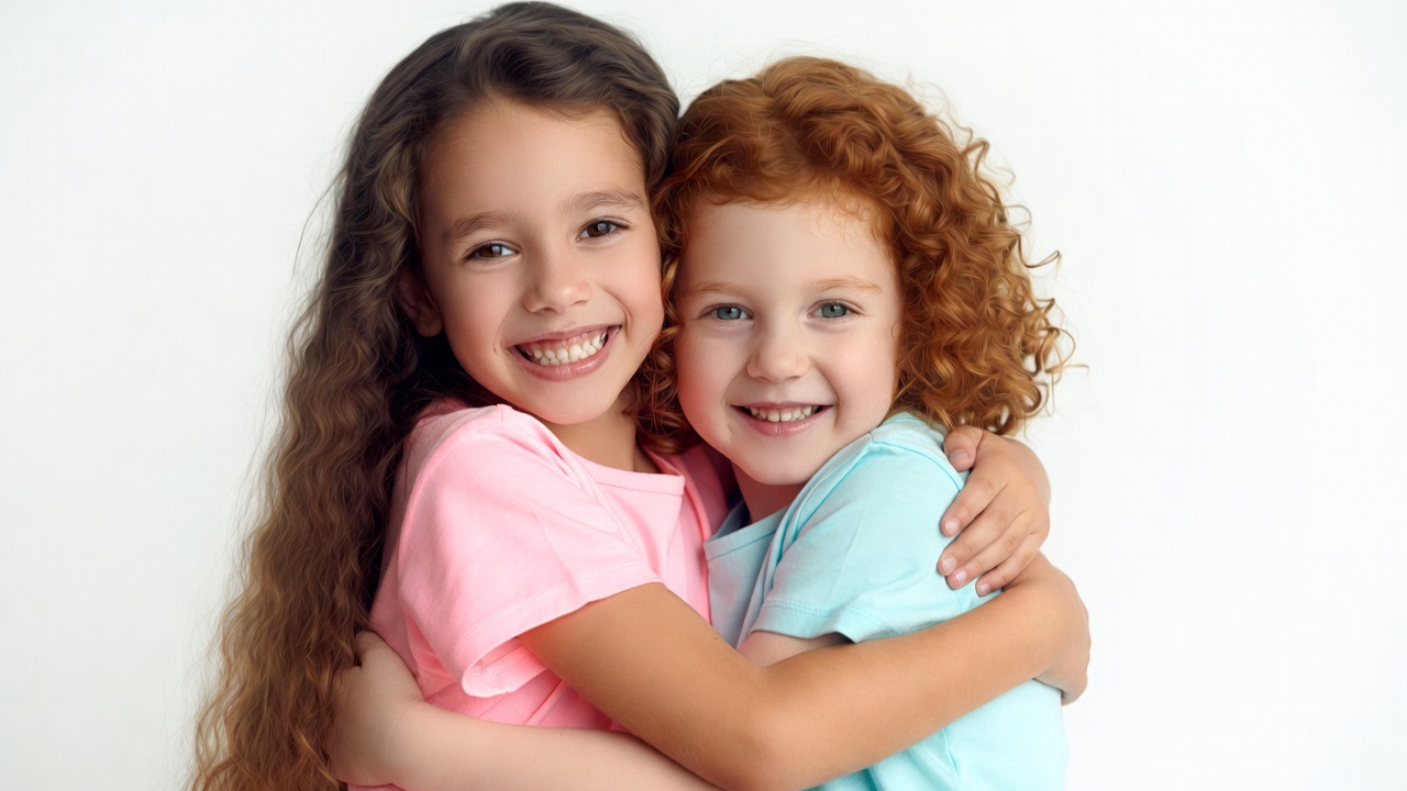 Two young girls with curly hair embrace each other tightly while smiling happily. One girl has long brown curls and wears a pink t-shirt, while the other has red curly hair and a blue t-shirt. They stand against a plain white background.