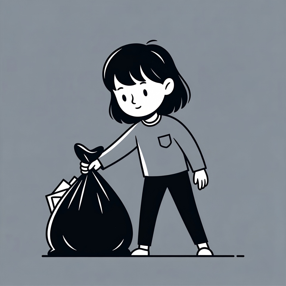 A cute cartoon girl with short black hair and a smiling face holds a large black trash bag filled with papers. She wears a gray sweater with a pocket and black pants, standing on a light gray background. The image is a simple black line drawing illustration.