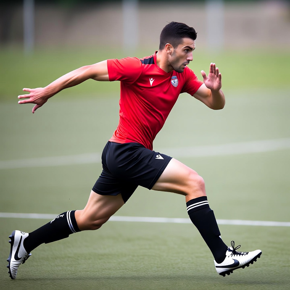 A muscular White man with short dark hair sprints dynamically on a green soccer field. He wears a red V-neck soccer jersey with blue accents, black shorts, black socks, and white Nike cleats. His arms are extended and one leg is lifted high in motion.