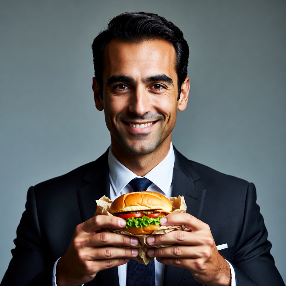 Middle Eastern, beard, black suit, burger, cheerful expression, dark hair, fast food, food, gray background, hamburger, hands holding, holding burger, lettuce, male, navy tie, professional attire, smiling man, suit, white shirt, wrapper, man