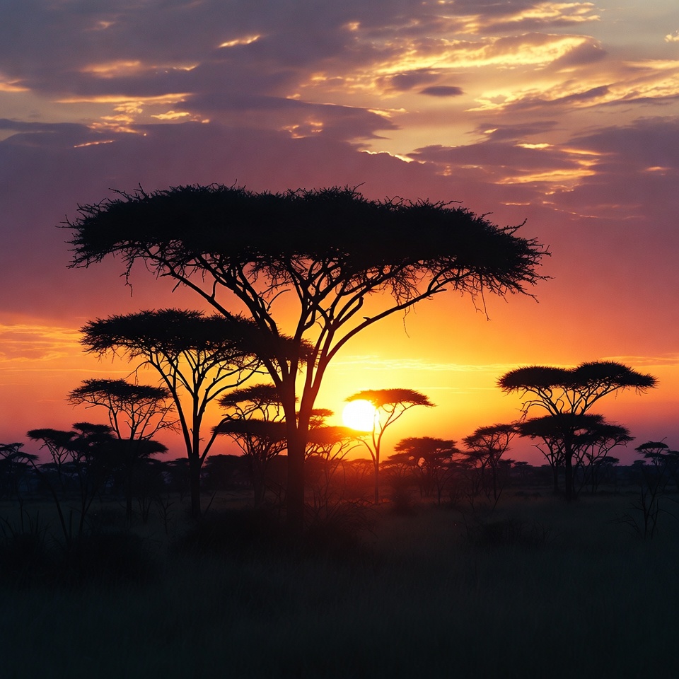 African landscape, dramatic sky, golden hour, grassland, horizon, nature, orange sky, purple clouds, safari scenery, savanna, silhouette, sun, sunset, tree silhouettes, wildlife habitat, acacia trees