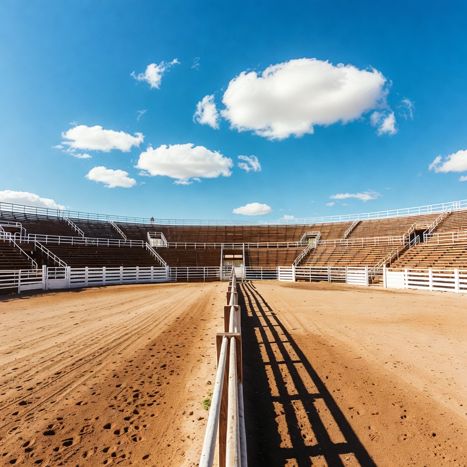arena fence, blue sky, bull riding arena, dirt arena, empty arena, empty stadium, outdoor arena, rodeo stadium, sand ground, shadows, stadium, white clouds, white railings, wooden bleachers, rodeo arena