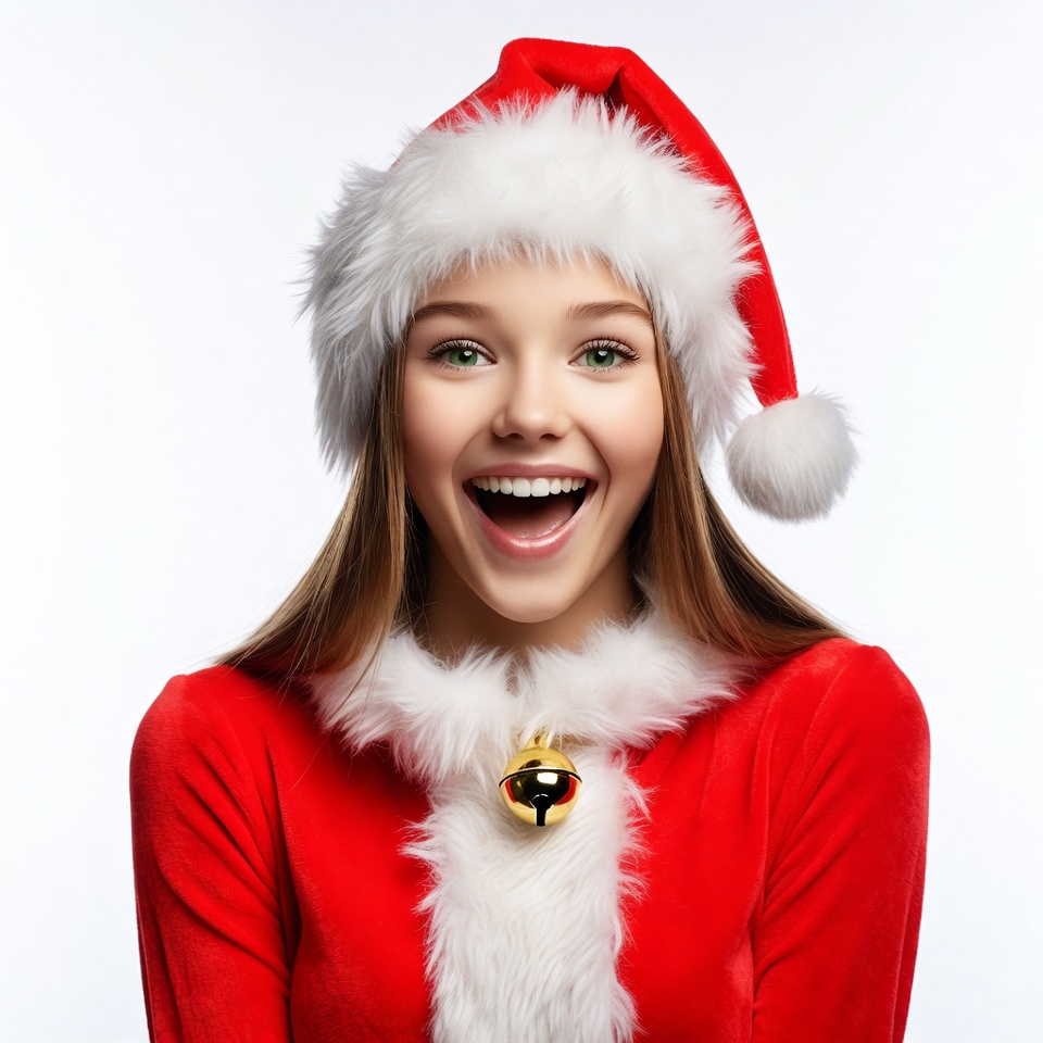 Christmas outfit, Santa dress, Santa hat, White, blonde hair, excited smile, female, gold bell, green eyes, holiday costume, necklace, red dress, smiling, white background, white fur, young woman, woman