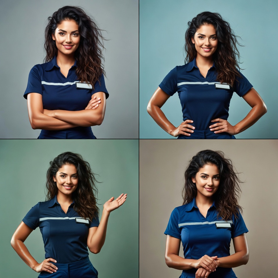 A beautiful woman with long wavy dark hair wears a navy blue collared uniform with name tag, posing confidently in four studio shots on colored backgrounds. She displays various gestures including arms crossed, hands on hips, one hand raised, and hands clasped. Her warm smile and professional attire suggest a healthcare worker like a nurse.