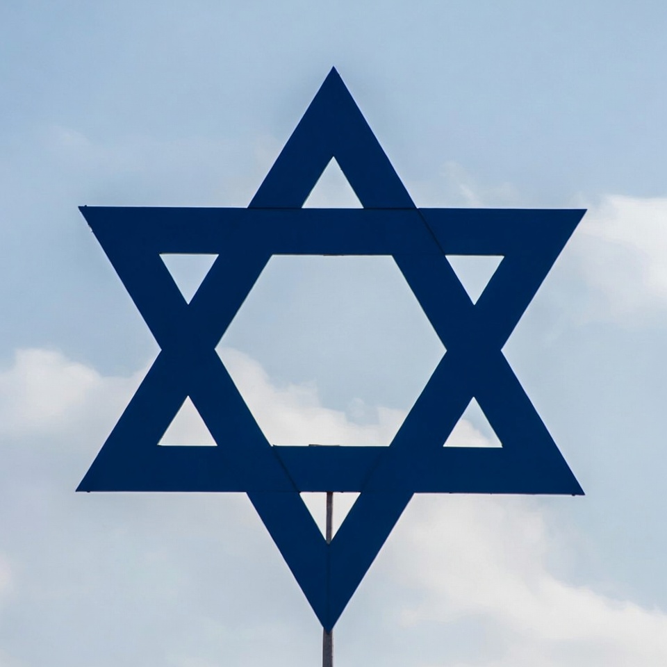 A large blue Star of David is mounted on a thin pole against a partly cloudy sky. The six-pointed star features bold outlines and a clear hexagonal center. It stands prominently isolated on a blue background.