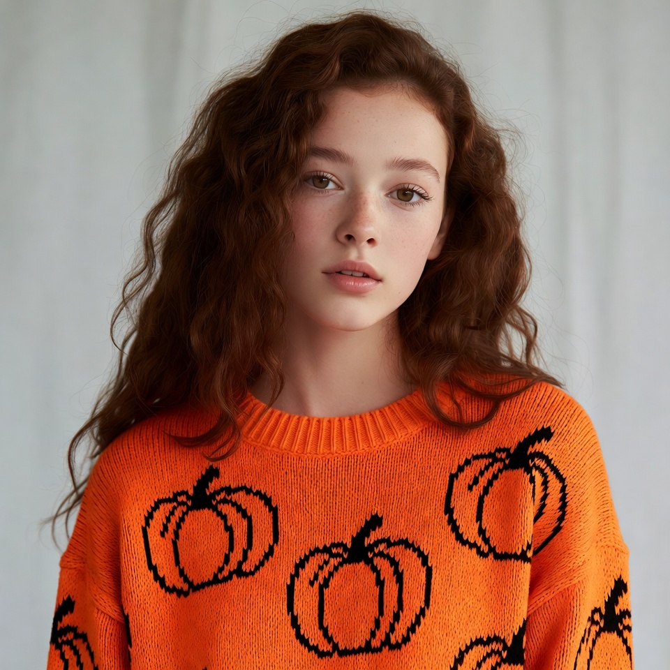 A young woman with long wavy red hair stands against a white background. She wears a bright orange sweater featuring black pumpkin designs and looks directly at the camera with a subtle expression. Her hair frames her face softly.