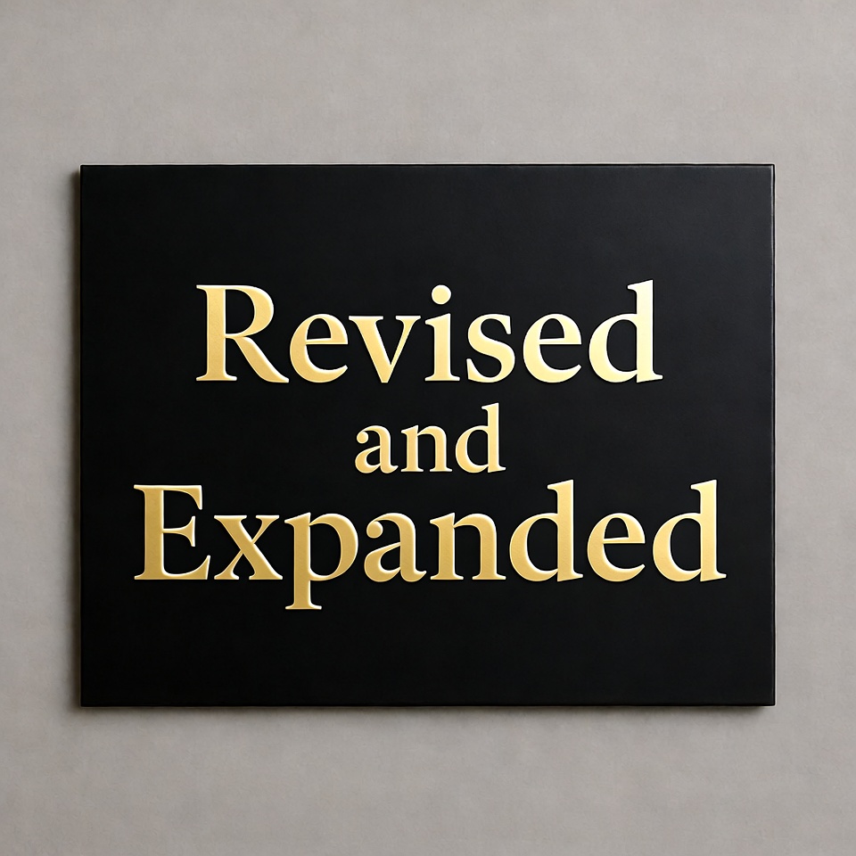 A black rectangular plaque features the gold-embossed text 'Revised and Expanded'. The elegant lettering stands out prominently against the dark background. The plaque is displayed against a light gray surface.