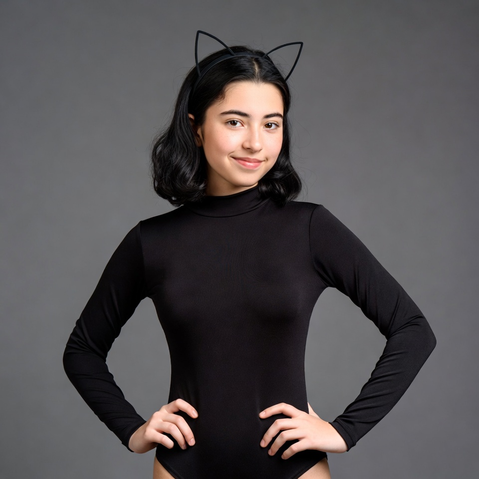 A young Asian woman with shoulder-length dark wavy hair and cat ear headband smiles at the camera. She wears a tight black long-sleeved bodysuit with hands on hips, standing against a plain gray background. Her expression is cheerful and playful.