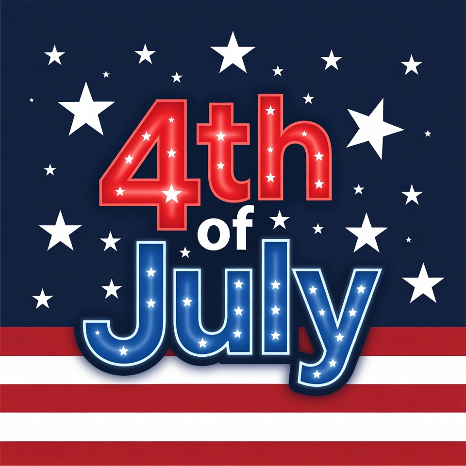 A vibrant digital illustration features the text '4th of July' in bold red and blue letters on a dark navy background. White stars are scattered around the text, and red and white stripes run along the bottom. The design uses glowing effects for a festive Independence Day look.