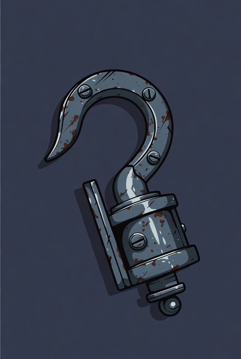 A detailed illustration of a rusty metal hook with bolts and a mounting bracket. The hook features a curved tip and weathered gray surface against a dark blue background. It appears industrial and aged with realistic rust effects.
