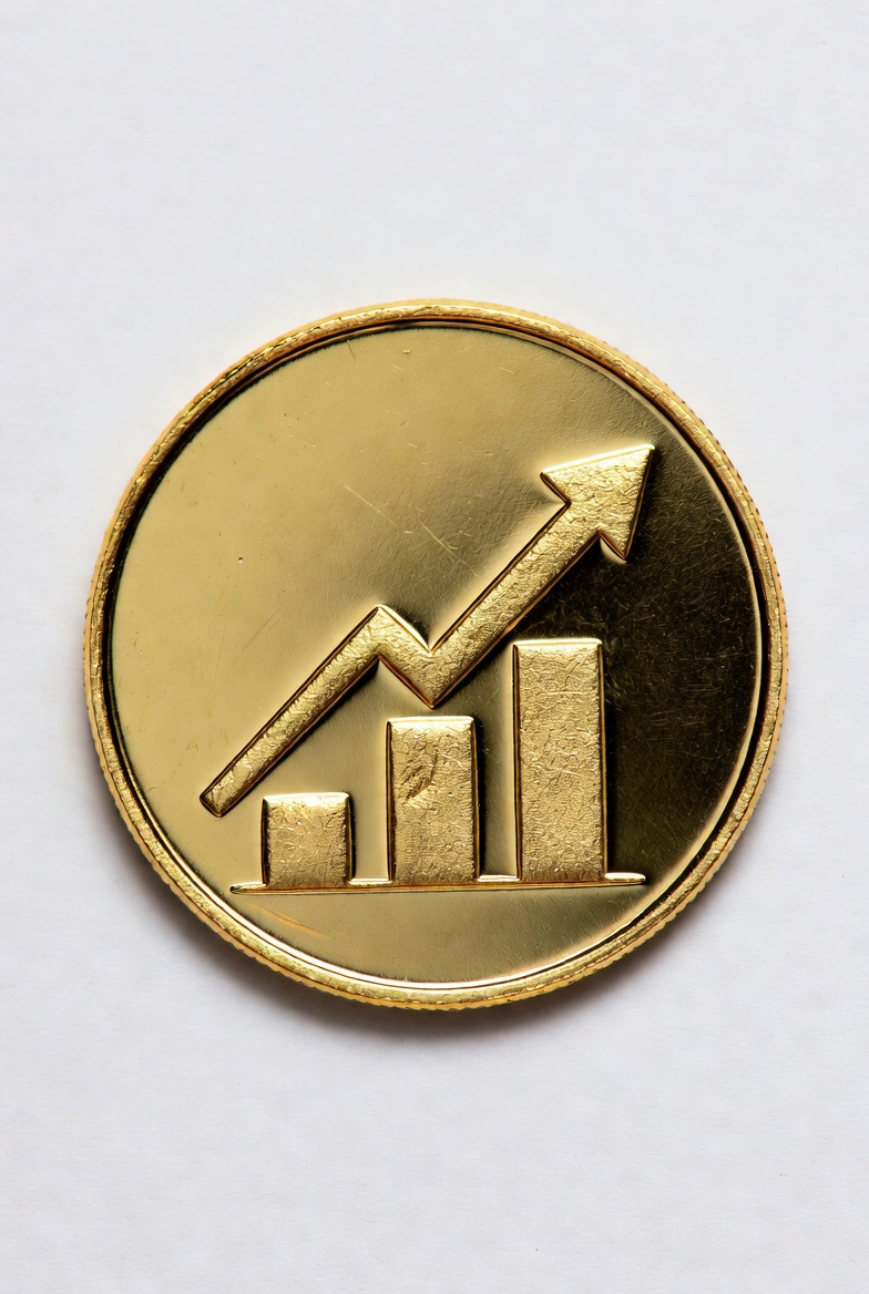 achievement, bar chart, bullish trend, business chart, coin design, economy, finance symbol, financial growth, golden emblem, graph coin, growth arrow, investment, isolated background, metallic coin, profit, rising bars, stock market, success icon, upward graph, gold coin