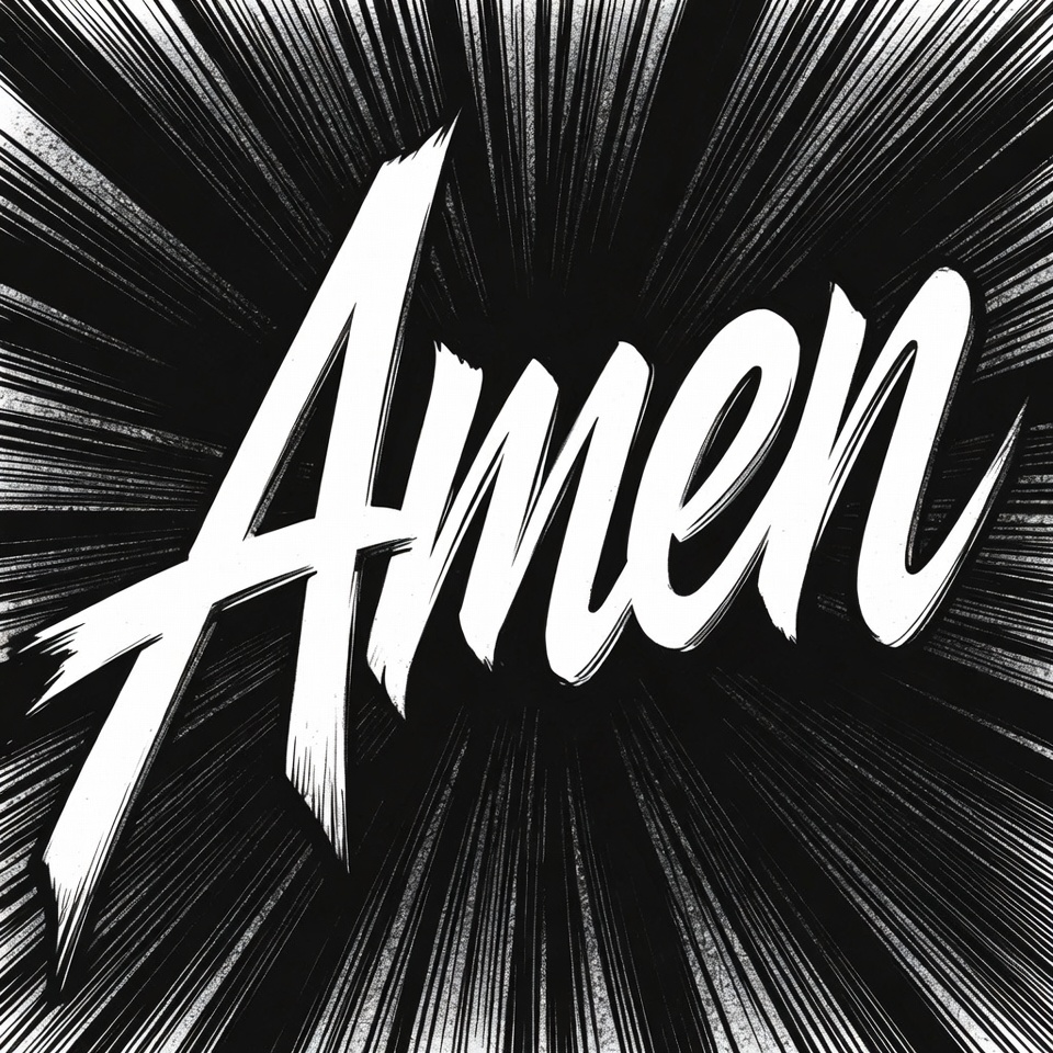 black background, brush font, burst, clipart, comic style, dynamic, explosive, graphic, illustration, isolated background, manga style, motion effect, radial lines, religious text, speed lines, stylized font, text, white text, Amen