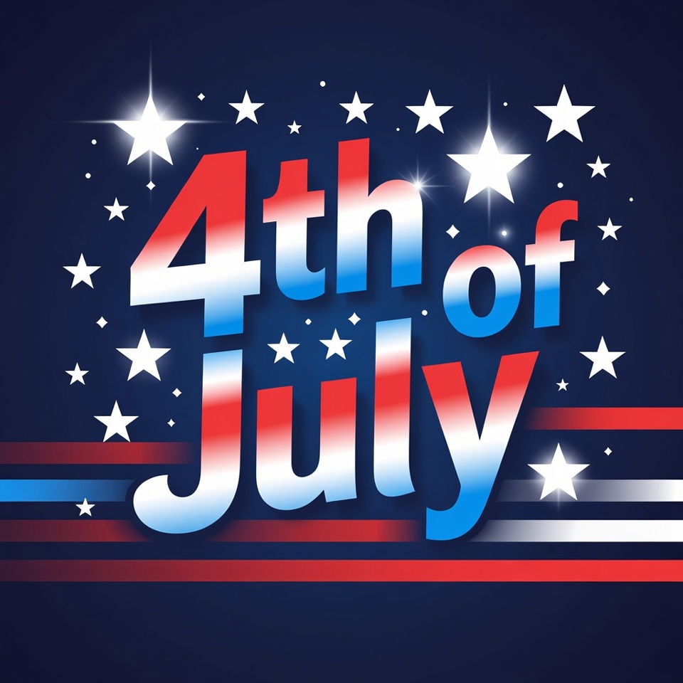 Bold '4th of July' text in red, white, and blue colors glows against a dark navy background. Sparkling white stars surround the festive lettering. Red, white, and blue stripes accent the bottom of the illustration.