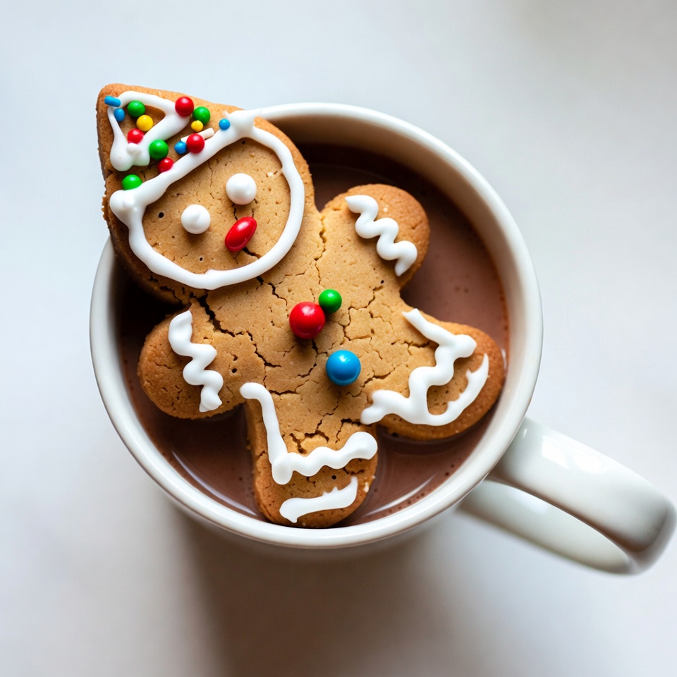A festive gingerbread man cookie with white icing face, red and green candy buttons, and colorful sprinkles on its hat floats in a white ceramic mug filled with thick hot chocolate. The cookie features detailed icing outlines and a cheerful expression. The mug sits on a plain white surface.