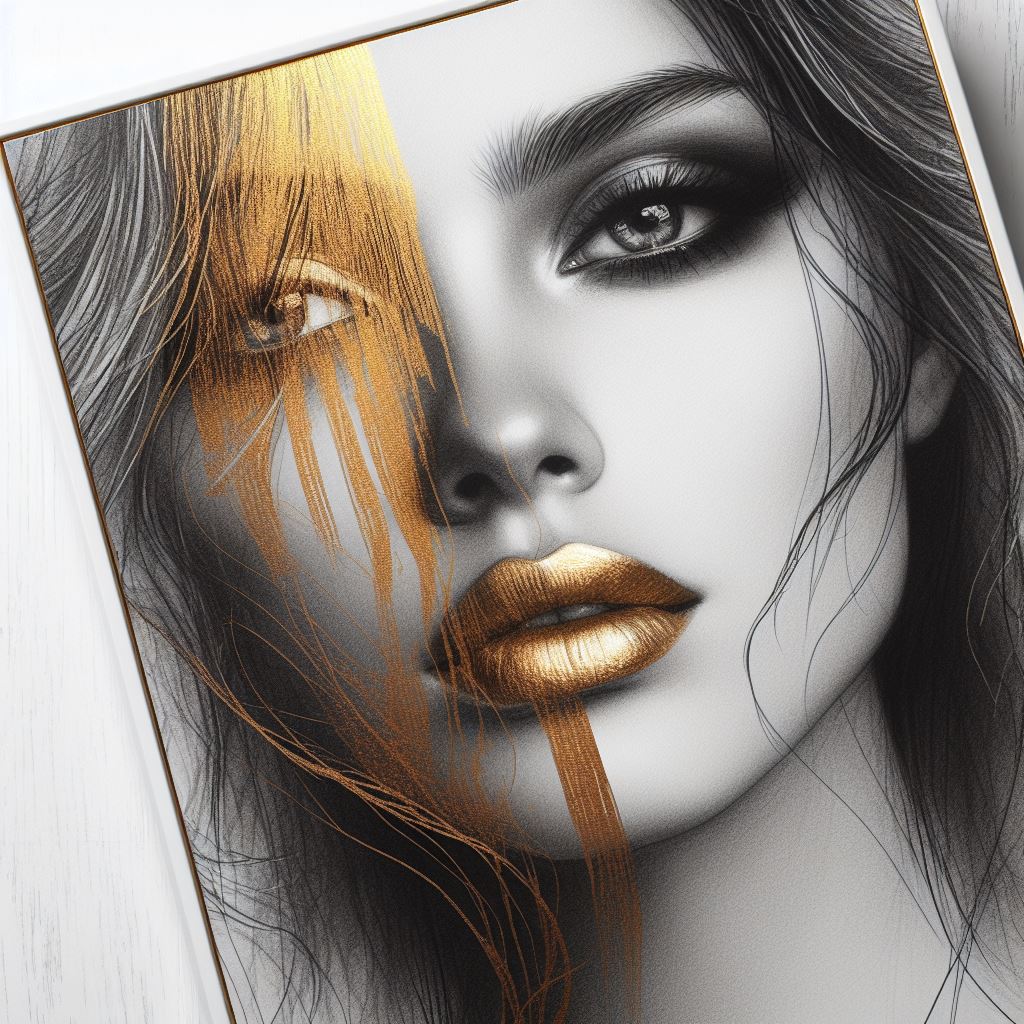 A black and white portrait of a woman with gold paint on her face. Her lips are painted gold, and there are gold streaks on her cheek.