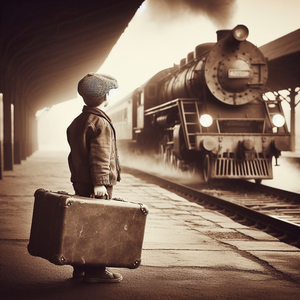 A young boy stands on a train platform, clutching a suitcase, as a steam locomotive departs.