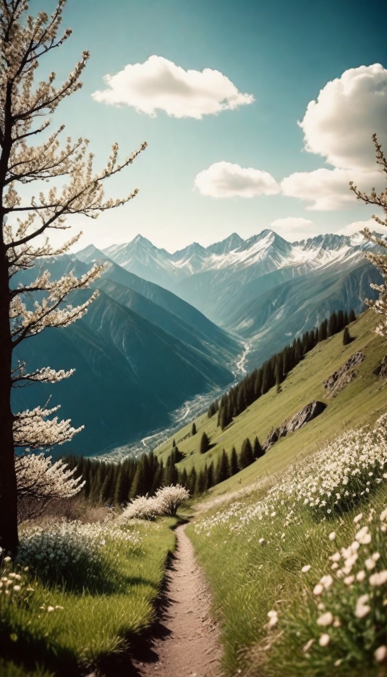 A winding path through a meadow of wildflowers leads to a view of snow-capped mountains in the distance.