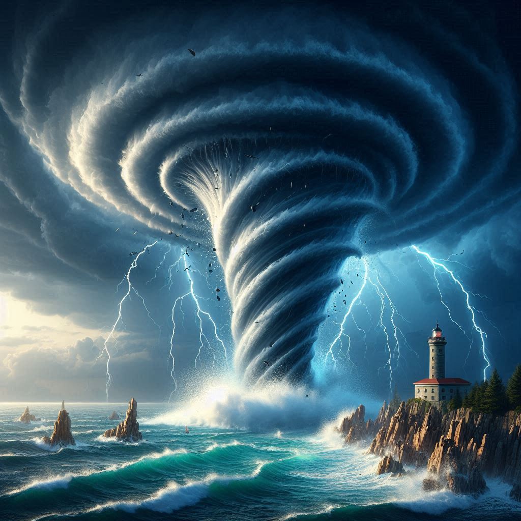 A waterspout swirls over the ocean, lightning hitting the water and cliffs. A lighthouse on the coast stands tall, lit by the storm