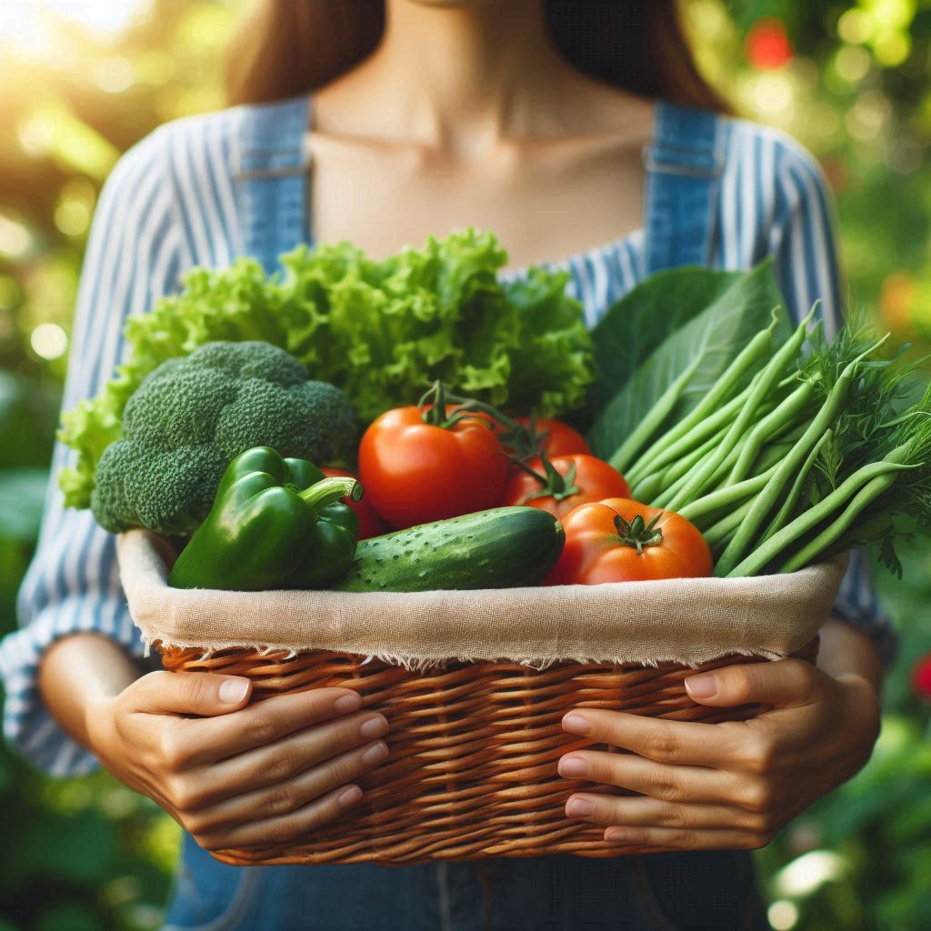 A woman's hands hold a woven basket filled with various vegetables, including broccoli, green bell peppers, tomatoes, cucumbers, and green beans