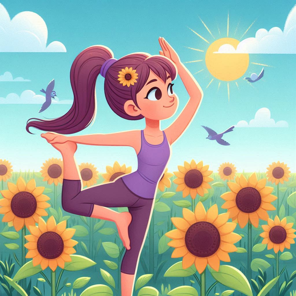 A girl performs a yoga pose in a vibrant sunflower field during a sunny morning, surrounded by blue skies and birds flying.
