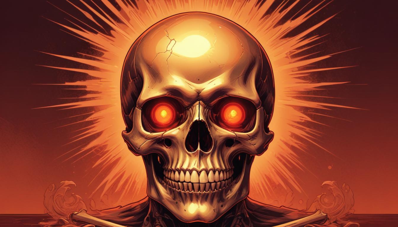 A detailed skull with fiery orange eyes stands out against a dramatic, glowing background, creating a striking visual effect.